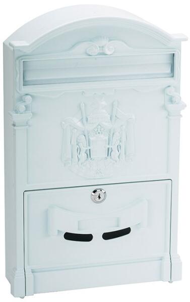 Utcai horganyzott acél postaláda aluminium öntvény előlappal, felső bedobónyílással, fentről lefelé nyíló zárható ajtóval, 2 db gyári kulccsal. Házfalra, vagy kerítésre egyaránt felszerelhető.